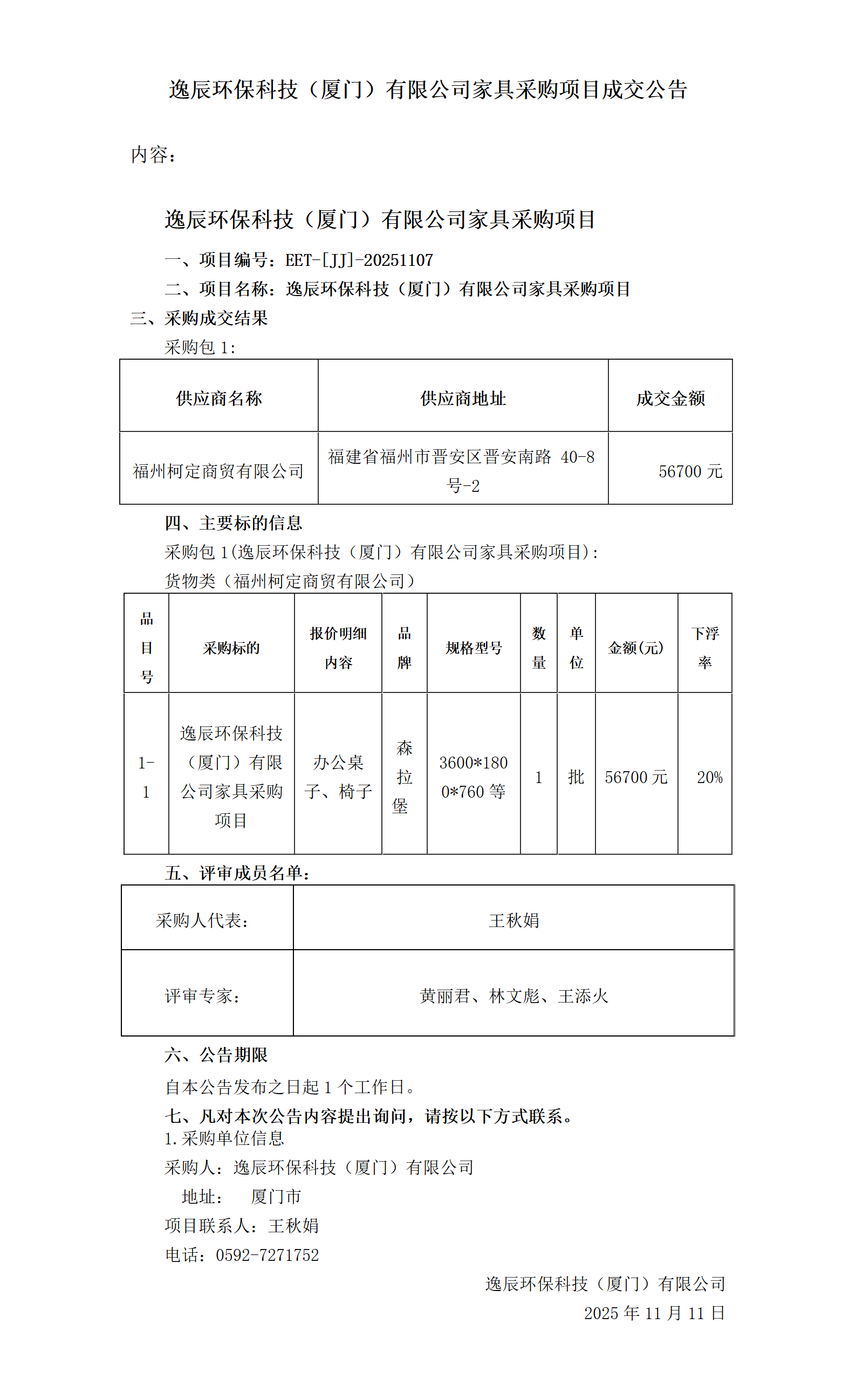 逸辰环保科技(厦门)有限公司家具采购项目成交公告